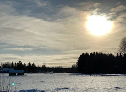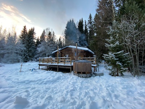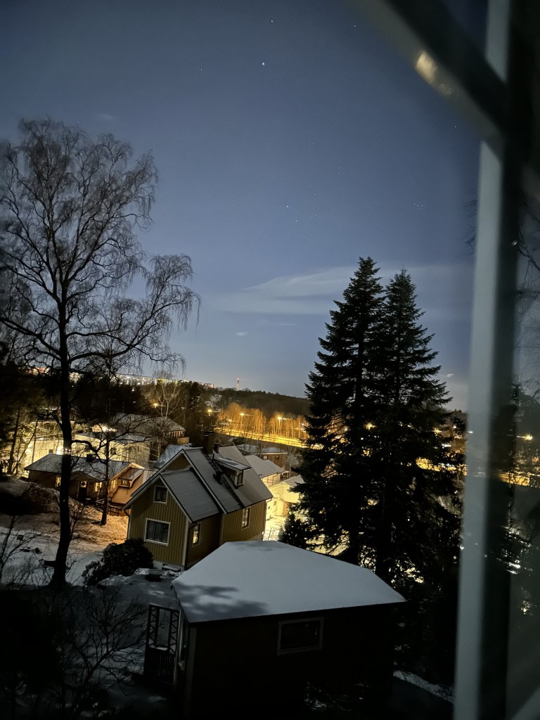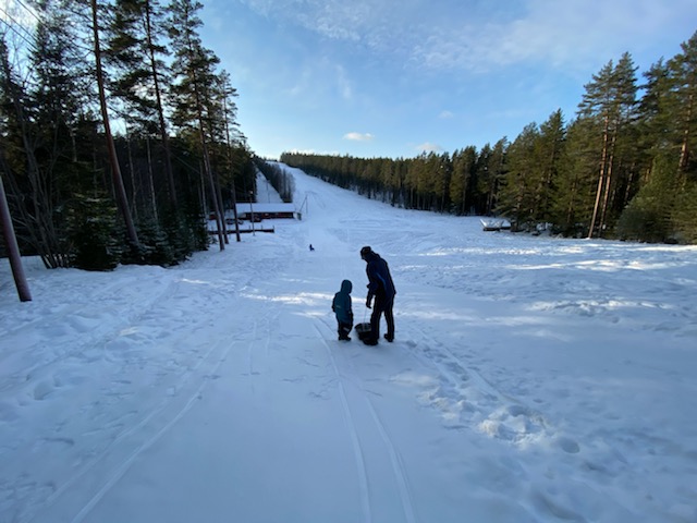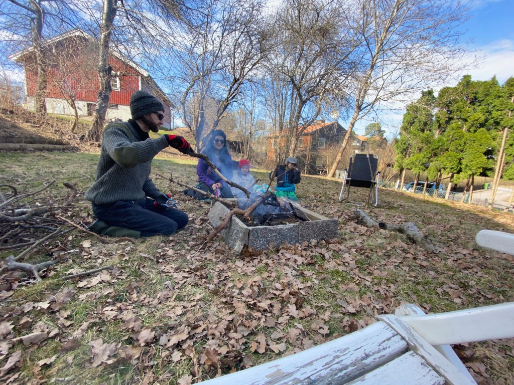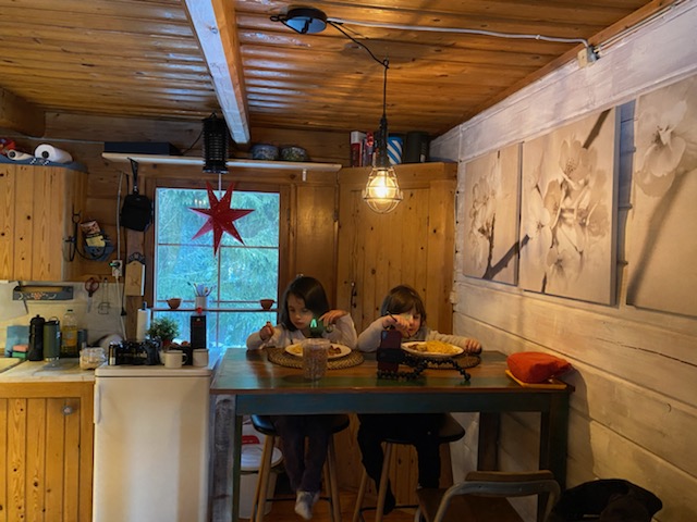 Por 6 días nos dimos una escapada de la ciudad y de la realidad. Nos montamos al auto lleno de chamarras, ropa térmica, cascos, gorros, galletas y una guitarra con todo y su estuche que pesa el doble de la guitarra. Los pequeñines aguantaron muy bien el camino de 3 horas escuchando sus cuentos infantiles y audiolibros. Entre el Feuerwehrmann Sam y Findus & Pettson, el tiempo pasó rápido. El contraste de los cielos azules con los prados blancos nos hizo brillar los ojos. Fueron seis días de felicidad, cada día al calor de la leña el frío se sentía menor. Una noche titiritando llegamos hasta -20°C! Eso sí que se sentía fuerte, aunque abrazada de mi buen Feliciano, ya no había de qué preocuparse. Cada día el trabajo de poner la leña al fuego para calentar la casa, el sauna o el jacuzzi eran un buen incentivo para entrar en calor y después relajarnos. Los niños se divirtieron jugando a las escondidas, pintando, ayudando a poner la chimenea, saliendo a andar en los trineos en la nieve, ejercitando sus patadas de crawl en el jacuzzi, etc. Un día fuimos al parque de los alces y fue la cosa más espectacular haber estado tan cerca y tocando la cara de un alce con grandes cuernos. Dicen sus cuidadores que ese alce es mitad caballo, un cuarto perro y el resto alce y tuvo mucha razón, a pesar de que impone su tamaño y su presencia, son unos animales muy tiernos. Todo el día nos quedamos con la bonita sensación de haberlos visto. La cocina aunque pequeña, estaba equipada con todo el equipo necesario, todo funcionando y muy limpio. Pudimos hacer desde desayunos sencillos con cereal y leche hasta cenas deleitantes y suculentas como verduras a las brasas acompañadas de un buen trozo de carne de cerdo al horno y vino. Al final lo que gastamos en 6 días en el bosque sería lo que pagaríamos en dos idas a un restaurante pipirisnice solamente Feli y yo. Así que ya sabemos para la próxima cómo y dónde podemos reemplazar una cena especial 🙂