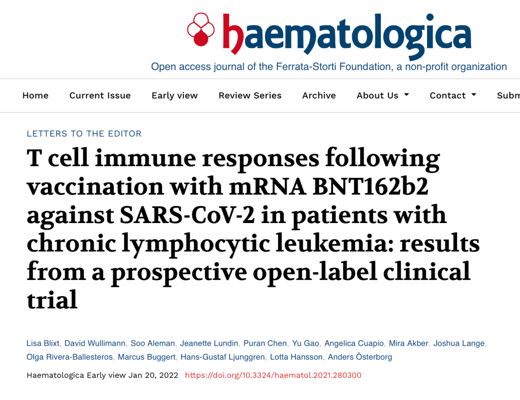 - Blixt L, Wullimann D, Aleman S, Lundin J, Chen P, Gao Y, Cuapio A, et al. T cell immune responses following vaccination with mRNA BNT162b2 against SARS-CoV-2 in patients with chronic lymphocytic leukemia: results from a prospective open-label clinical trial. Haematologica. 2022.