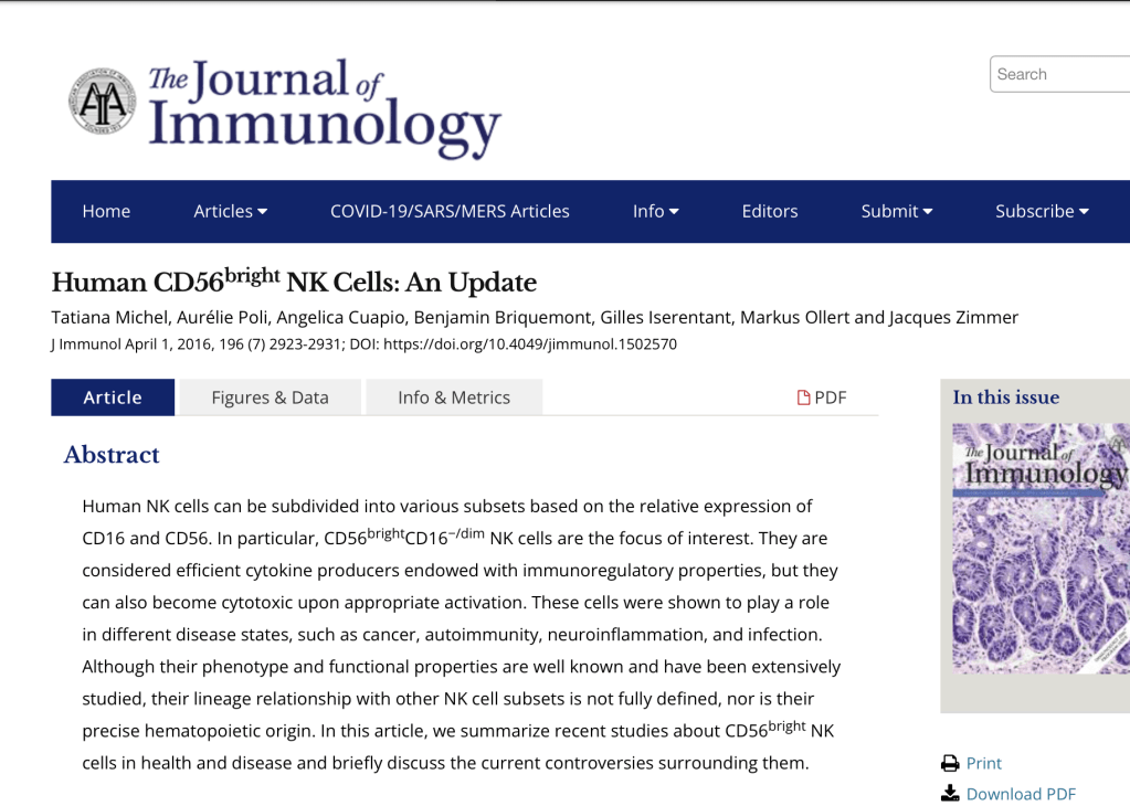 - Michel T, Poli A, Cuapio A, Briquemont B, Iserentant G, Ollert M, et al. Human CD56bright NK Cells: An Update. J Immunol. 2016;196(7):2923-31.
