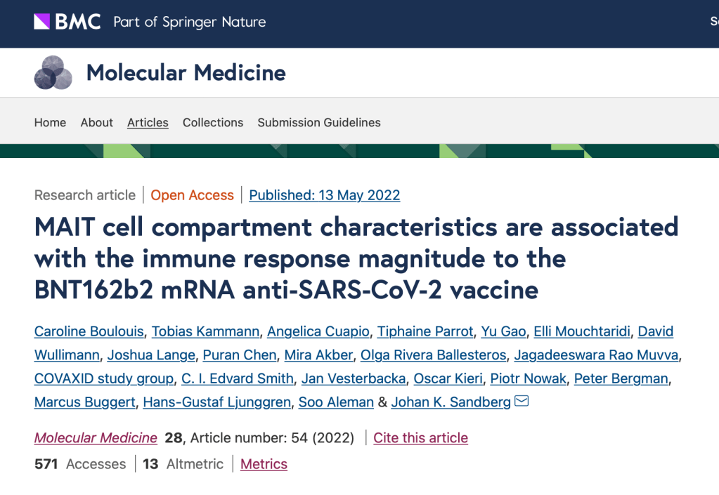 Boulouis C, Kammann T, Cuapio A, Parrot T, Gao Y, Mouchtaridi E, et al. MAIT cell compartment characteristics are associated with the immune response magnitude to the BNT162b2 mRNA anti-SARS-CoV-2 vaccine. Mol Med. 2022;28(1):54