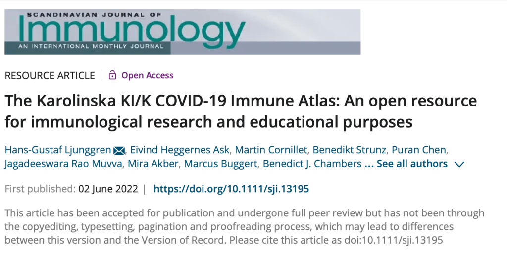 Ljunggren HG, Ask EH, Cornillet M, Strunz B, Chen P, Rao Muvva J, Cuapio A, et al. The Karolinska KI/K COVID-19 Immune Atlas: An open resource for immunological research and educational purposes. Scand J Immunol. 2022:e13195.