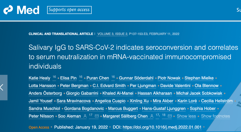 Healy K, Pin E, Chen P, Soderdahl G, Nowak P, Mielke S, Cuapio A, et al. Salivary IgG to SARS-CoV-2 indicates seroconversion and correlates to serum neutralization in mRNA-vaccinated immunocompromised individuals. Med (N Y). 2022;3(2):137-53 e3.