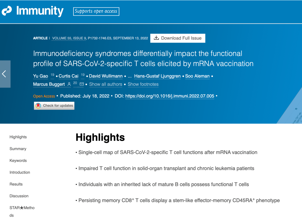 Gao, Y., C. Cai, D. Wullimann, J. Niessl, O. Rivera-Ballesteros, P. Chen, J. Lange, A. Cuapio, O. Blennow, L. Hansson, …, H. G. Ljunggren, S. Aleman and M. Buggert (2022). «Immunodeficiency syndromes differentially impact the functional profile of SARS-CoV-2-specific T cells elicited by mRNA vaccination.» Immunity 55(9): 1732-1746 e1735.