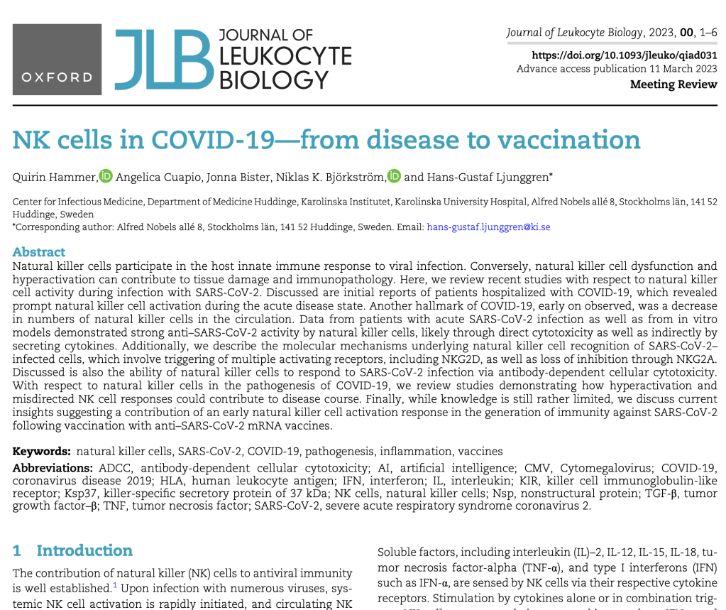 Hammer Q, Cuapio A, Bister J, Björkström NK, Ljunggren HG. NK cells in COVID-19 – from disease to vaccination. J Leukoc Biol. , 2023;, qiad031, https://doi.org/10.1093/jleuko/qiad031